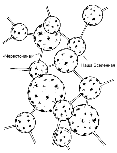 Рис. 12.2. Наша Вселенная может оказаться одним из бесчисленного множества параллельных миров, каждый из которых связан с остальными бесконечным множеством «червоточин». Путешествия по этим «червоточинам» возможны, но чрезвычайно маловероятны.
