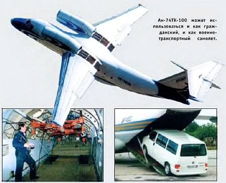 Ан-74ТК-100 — транспортный конвертируемый самолет — предназначен для грузовых, пассажирских и смешанных перевозок на авиалиниях малой и средней дальности. Причем трансформировать пассажирский вариант в транспортный в принципе можно за несколько минут — достаточно откинуть к бортам складывающиеся кресла и багажники ручной клади. Самолет способен взлетать и садиться на грунтовые взлетно-посадочные полосы.