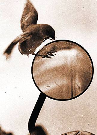 Вечером мы говорили о ткачиках, об их похожих на тучу скоплениях. А утром одна из птиц, похожая на воробья, устроила нам веселое представление. «Иди скорее сюда», — позвал я приятеля. У нашей машины возле зеркала вилась знакомая птичка, она боролась со своим отражением в зеркале. Вокруг толпилось несколько любознательных постояльцев гостиницы, а птица «клевала» зеркало и, видимо, решила прикончить «соперника». Минут пятнадцать продолжался этот поединок. (Вы видите его на снимке.) Когда птица в изнеможении села на зеркало, какая-то сердобольная старушка-путешественница накрыла зеркало платочком. «Жалко, но представление окончено!» — сказали все хором.