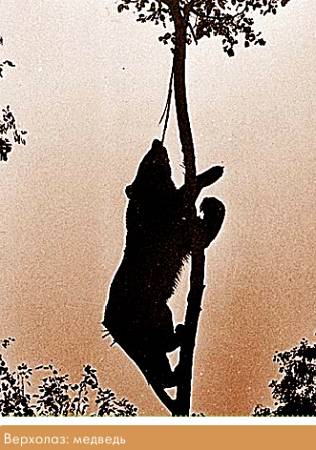 Медведь — хороший древолаз, но взрослый мишка с трудом может влезть на дерево. Зато медвежата мгновенно взлетают вверх — ищут спасения в том числе и от медведей, готовых прикончить малышей. А черные американские медведи пасутся и прячутся на верхушках деревьев; гималайский медведь с белой отметиной на груди постоянно держится Верхолаз: медведь наверху и неохотно спускается на землю. И берлоги этот медведь не строит — ищет большое дупло, в нем зимует. Помню заметку в газете: спилили лесорубы в Приморье большое дерево, а в его дупле — медведь! Этот древолаз одинаково влезает на большое дерево и на маленькое тоже (смотрите снимок).