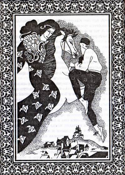 Только сказала, как за окном потемнело, ветер засвистел, буря на замок налетела, подхватила Снегирька и к подножию горы сбросила. Мгла пала на замок и превратилась в черного всадника, только лицо его белело, как из снега вылепленное, и старо было, как сам мир, и глаза за косматыми бровями на остывшие угли походили, да на ресницах иней осел. Долго бились они, лес стонал, и земля гудела… Наконец изловчился молодец, выбил из седла злодея и веревкою опутал. Тут вгляделся — и глазам своим не поверил: перед ним тот красавец воевода, что когда-то на обоз царевны напал. Ничего не понял Снегирек, однако потащил противника в замок. Зашел опять в тронный зал, а там на месте Василисы Прекрасной Баба Яга сидит, и из глаз ее слезы текут.