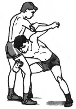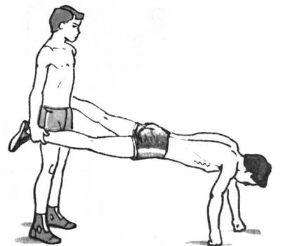 Для выполнения следующей части упражнения нужен третий партнер, который сядет вам верхом на лопатки (б). Не пытайтесь этого делать на первых тренировках, если ваша физическая подготовка далека от совершенства. Такое упражнение вы сможете выполнить тогда, когда станете гораздо мощнее, чем сейчас.