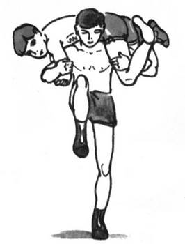 Ну вот, теперь вы уже можете переносить на себе человека такой же, как у вас, или даже несколько большей массы на значительные расстояния. Это самый удобный способ транспортировки, хотя и не самый комфортный для переносимого. Кстати, человека, находящегося в бессознательном состоянии, в одиночку транспортировать гораздо сложнее, чем того, кто активно помогает несущему, напрягая мышцы. У расслабленного тела постоянно меняется центр тяжести, так что требуются значительные усилия при транспортировке, чтобы сохранить равновесие.