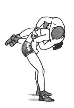 Возьмите одной рукой разноименную руку стоящего лицом к вам партнера выше локтя, а другой рукой – ногу, одноименную захваченной руке, изнутри выше колена (а). В положении полуприседа подойдите грудью вплотную к захваченному вами бедру и, за руку затягивая партнера к себе на шею, поднимитесь, выпрямляя ноги. Подныривая под партнера, не сгибайтесь пополам, потому что из такого положения вы не сможете разогнуться, когда он окажется у вас на шее (б). Партнер должен скрестить ноги и согнуть их в коленных суставах, чтобы бедра сжимали вашу руку, а пятки касались ягодиц. Руки он должен завести вам в подмышечные впадины. В таком компактном состоянии он становится легче (в).