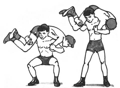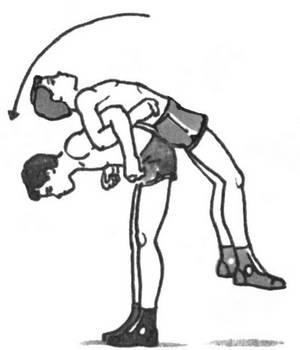Стоя спиной друг к другу, сцепитесь локтями и по очереди делайте наклоны вперед. Партнер, находящийся сверху, расслабляет мышцы ног и спины. Задержитесь в этом положении на несколько мгновений. Стоящий внизу учится брать на спину массу партнера, что важно уметь борцу.