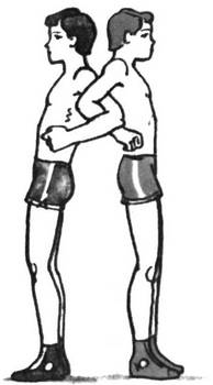 Партнеры стоят спиной друг к другу, сцепившись локтями. Опираясь друг на друга лопатками, приседайте и вставайте вместе с партнером не менее десяти раз.
