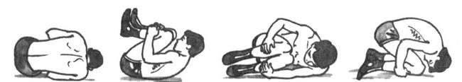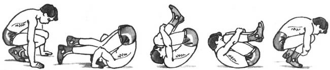 Сядьте на корточки и обхватите голени руками; свалитесь на бок, не меняя положения (а); перекатитесь сначала на спину (б), потом на другой бок (в), затем на колени (г) и так далее… до конца ковра. Главное – не размыкайте рук.
