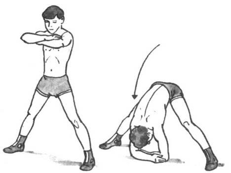 70. Наклоны вперед с касанием ковра локтями (рис. 57).