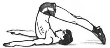 Лягте на спину, руки вдоль туловища, ноги прямые, носки оттянуты. Не сгибая ног в коленных суставах, достаньте ими ковра за головой. Медленно, без удара пятками о покрытие опустите ноги в и. п. В дальнейшем выполняйте упражнение, не опуская ноги, а удерживая их на весу под углом примерно в 10°.