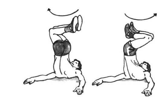 Встаньте на лопатки и шею, высоко подняв таз и опираясь всей поверхностью рук о ковер. Ноги согните в коленных суставах (пятки у ягодиц). Спина перпендикулярна ковру. Вращайте тазом с наибольшей амплитудой вправо и влево.