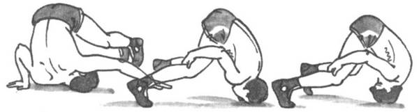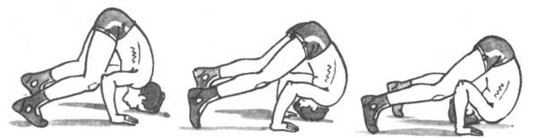 Головой, руками и ступнями упритесь в ковер, высоко подняв таз. Перенесите центр тяжести на шею. Со лба накатитесь на затылок и обратно, осуществляя движение вперед-назад (а, б, в); перекат с боку на бок, стараясь из этого положения коснуться ковра поочередно одним и другим ухом (г); круговые движения по и против часовой стрелки.