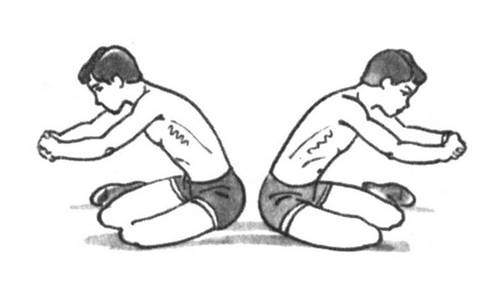 И. п.: вы на коленях, руки перед грудью «в замке». Опуститесь справа от своих голеней на ягодицы, затем без помощи рук перенесите туловище в положение слева от голеней.