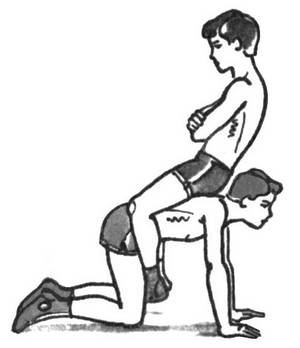 Партнер становится на четвереньки, опираясь о ковер коленями и кистями (но не локтями!). Сядьте ему на спину так, чтобы вы с ним смотрели в противоположные стороны.