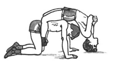Руки на затылке или скрещены на груди. Ступнями зацепитесь за внутреннюю часть верхней трети бедер партнера, заведите их в его паховые области (а). Разогнувшись назад, достаньте головой ковер (6), затем вернитесь в и. п. Когда вы разгибаетесь, партнер опускает голову; когда поднимаетесь – поднимает. Сделав упражнение, поменяйтесь с партнером местами.