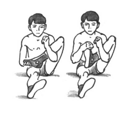 Выпрямленную руку положите кистью на ковер и ногой толчками надавливайте на область локтевого сустава в направлении против естественного сгиба, каждый раз с большим усилием. Размяв связки локтевого сустава, вы уменьшите возможность их травмы во время схватки.