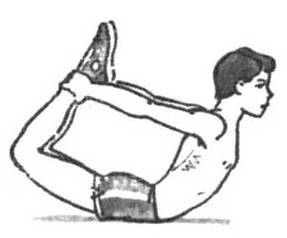 Лягте на живот. Возьмитесь за голени выше лодыжек и сильно прогнитесь назад, откинув голову и подтягивая к себе ноги.