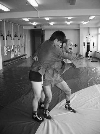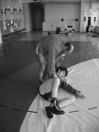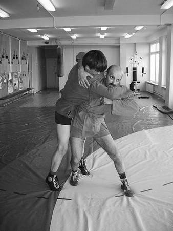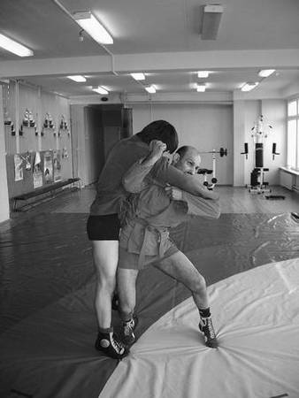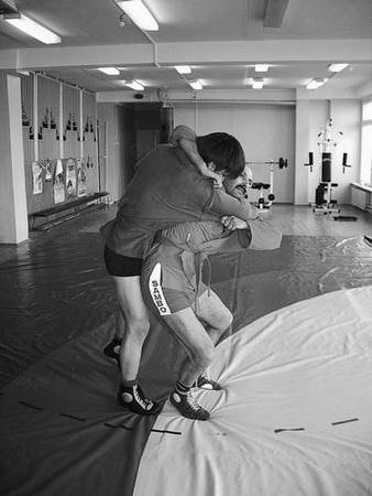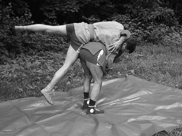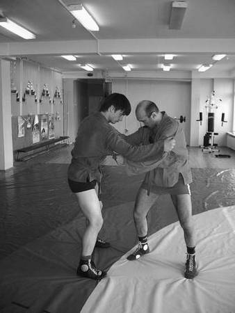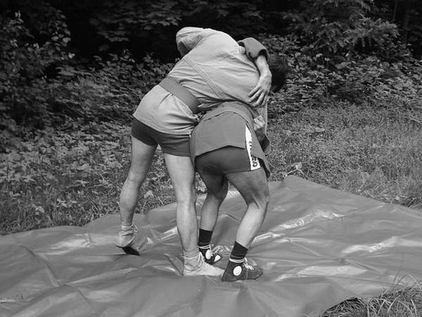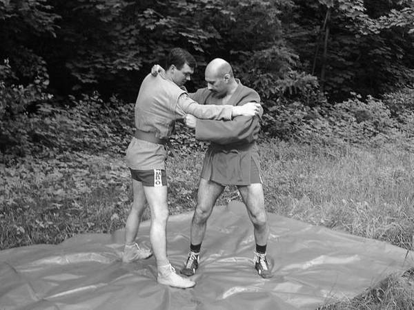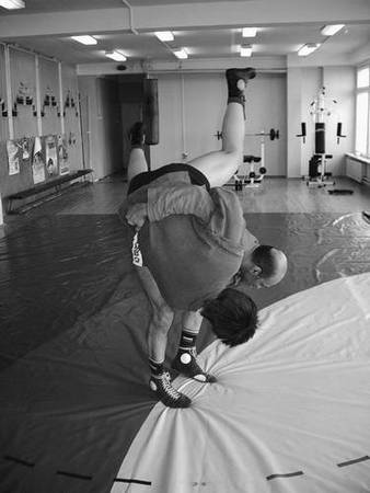 По команде «Делай раз» шагните правой ногой (с переносом на нее центра тяжести) к партнеру, одновременно осуществляя тягу левой рукой за его правую, как и при проведении броска через бедро. Плечевую часть вашей правой руки подведите в правую подмышечную впадину партнера и, прижавшись к нему правой стороной груди, на бицепсе приподнимите его, заставляя встать на носки.
