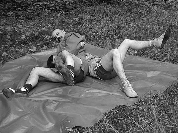 По команде «Делай три» одновременно сделайте три движения в разных плоскостях: резко распрямите согнутые ноги, встав на носки (а); наклонитесь вперед (б); разверните плечи, продолжая движение руками (в). Голова партнера – у вас между ног. В конечной фазе падения подтяните его за рукав вверх.
