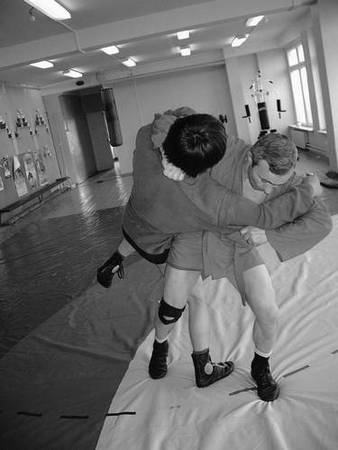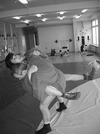 правой рукой вы захватываете левый отворот куртки, левой – правый рукав (разноименный захват) (рис. 95)