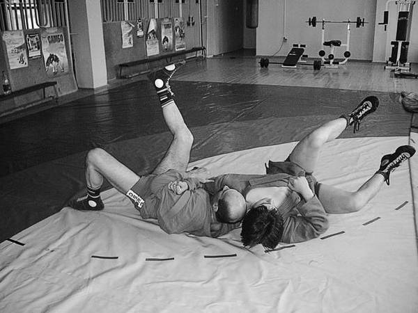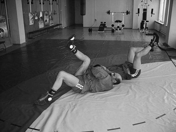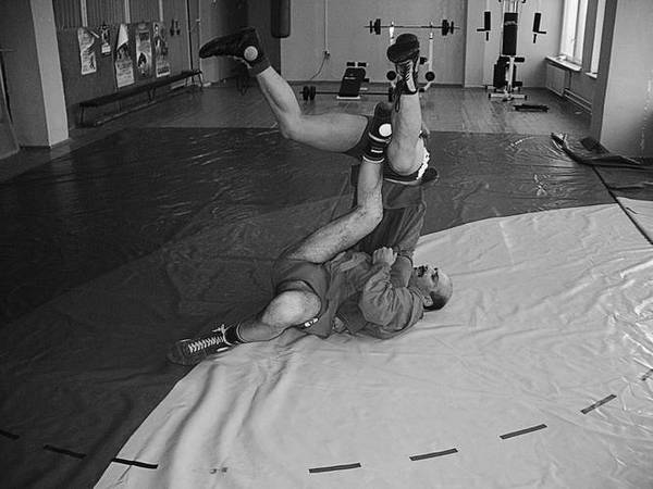 По команде «Делай три» перекатитесь по своей округленной спине от ягодиц к лопаткам, одновременно подбивая голенью левое бедро партнера. В темпе движения накатитесь на него сверху через свой правый плечевой сустав. Если захват останется плотным на протяжении всего движения, успех вам обеспечен.