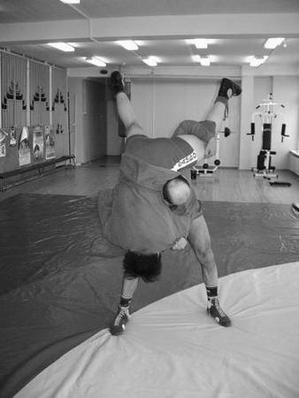 После падения партнера подтянитесь на руках и, сделав кувырок назад (через левое плечо в первом варианте, через правое – во втором), окажитесь на нем сверху для атаки его в партере, но об этом ниже. Самостраховка при падении заключается в том, чтобы встретить ковер пятками.