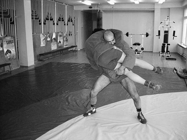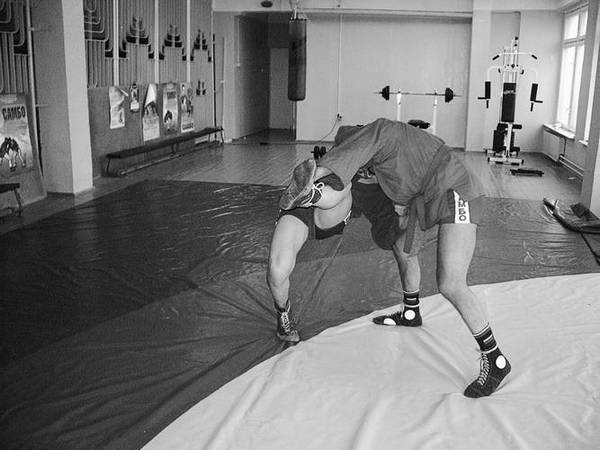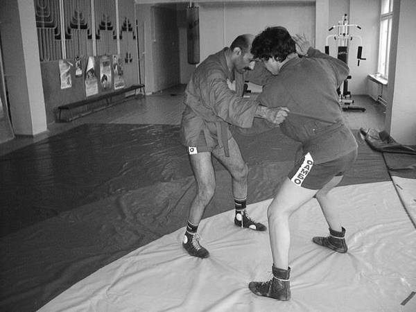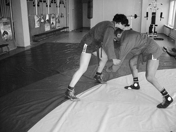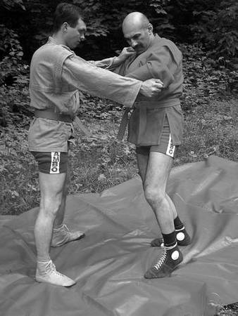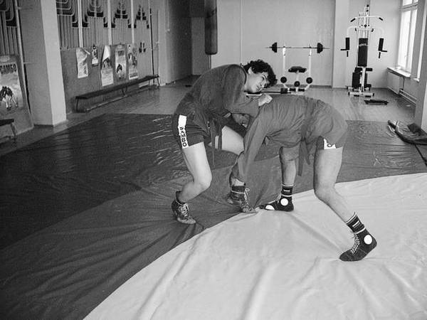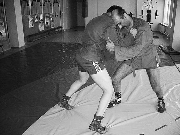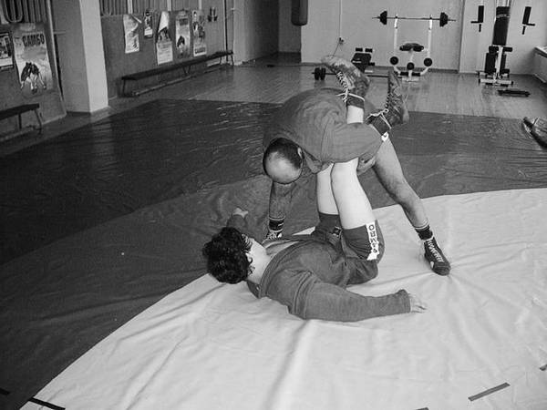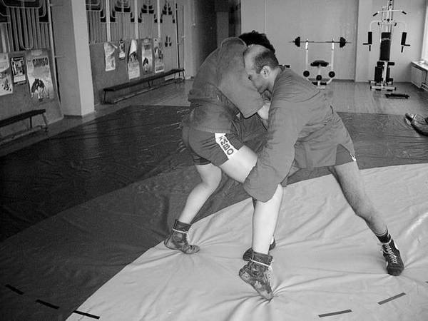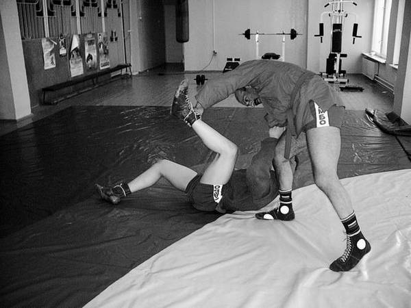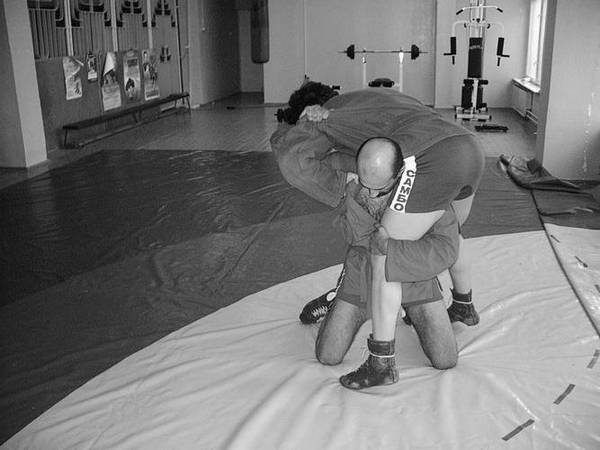 По команде «Делай раз» шагните к партнеру и крепко обхватите его бедра выше коленей, прижимаясь к ним грудью. В схватке старайтесь делать это быстро, чтобы противник не успел развести ноги.