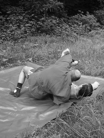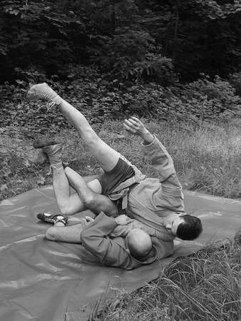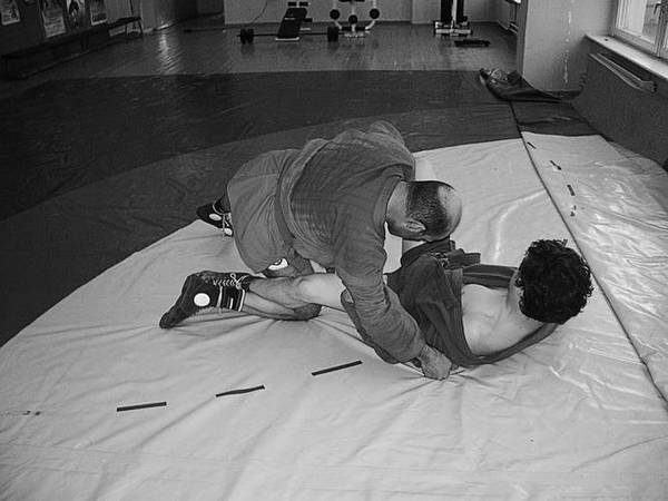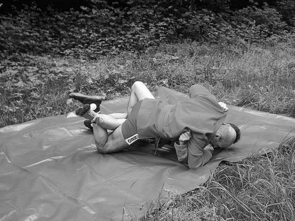По команде «Делай три», скручивая партнера в сторону его блокированной ноги, навалитесь всей массой на его голень и, когда он упадет, постарайтесь накрыть его сверху.