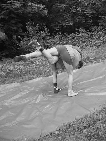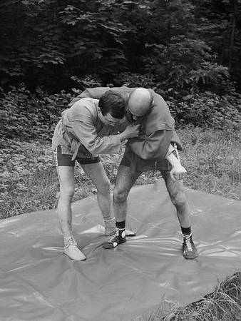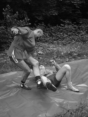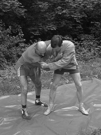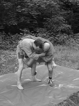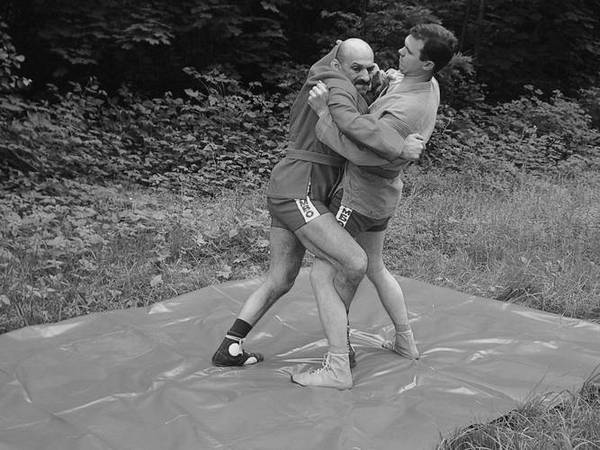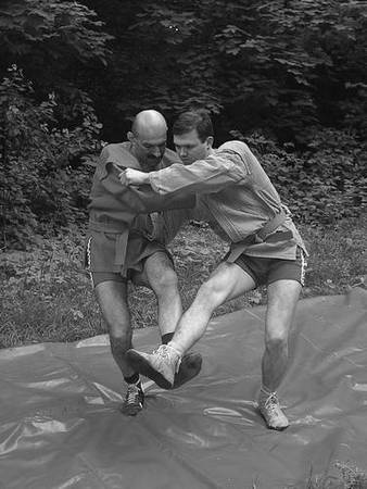 По команде «Делай два» обхватите его голень снаружи бедром и голенью правой ноги. Разворачивая свое туловище и руки в правую сторону, грудью навалитесь на партнера, чтобы его центр тяжести ушел за ступни назад, а ваша правая нога не давала бы ему возможности, отшагнув, восстановить равновесие.