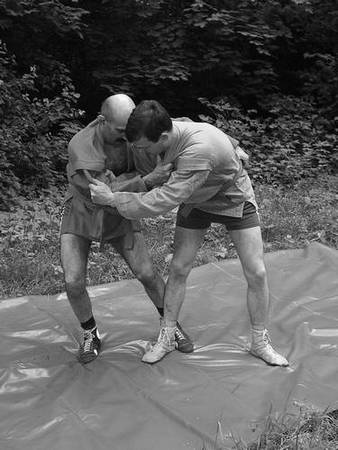 И. п.: плотный захват рук (вообще здесь можете поэкспериментировать и выбрать наиболее удобный для себя захват).