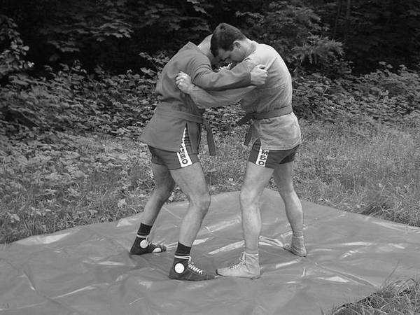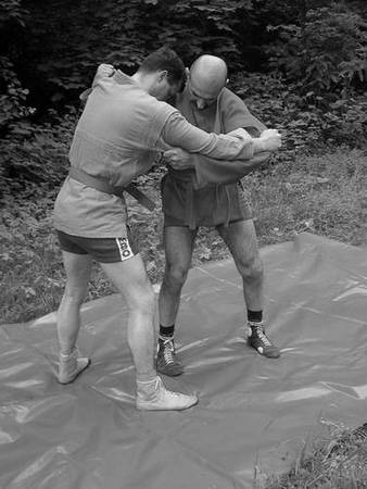 И. п.: ваша левая рука захватывает правый рукав партнера выше локтевого сгиба. Правая держится за пояс или захватывает куртку на спине (рис. 120).