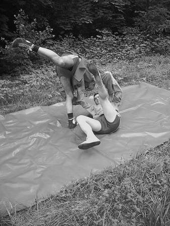 По команде «Делай три» начните проводить бросок, чуть вывернув вовнутрь ногу, которой обвили ногу партнера. Падая с прогибом назад, выворачивайте ее наружу, как в упражнении 29 гл. II (заведение за себя согнутой в колене ноги); подняв на ней партнера и развернув в воздухе по часовой стрелке, бросьте на лопатки. При этом постарайтесь, описав в падении дугу, оказаться на животе, накрыв партнера.