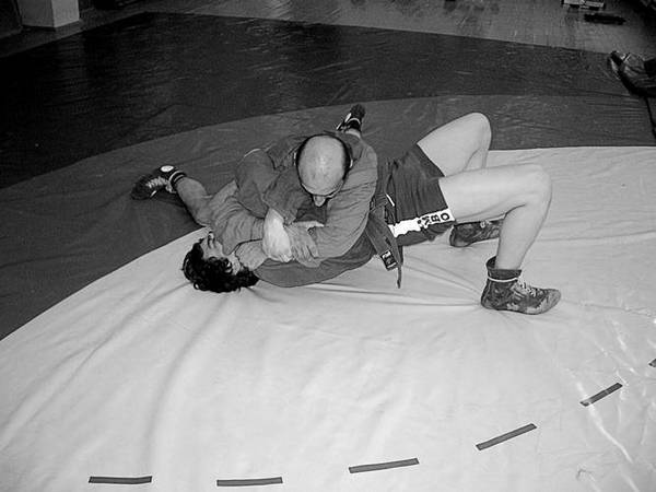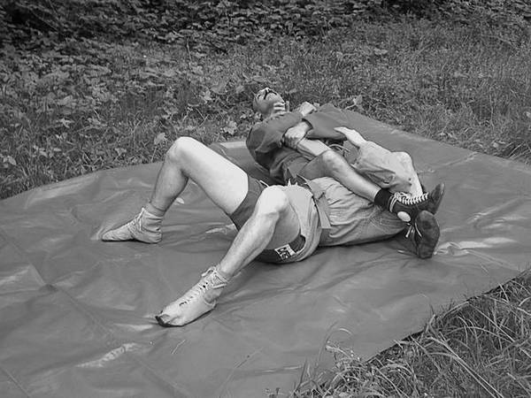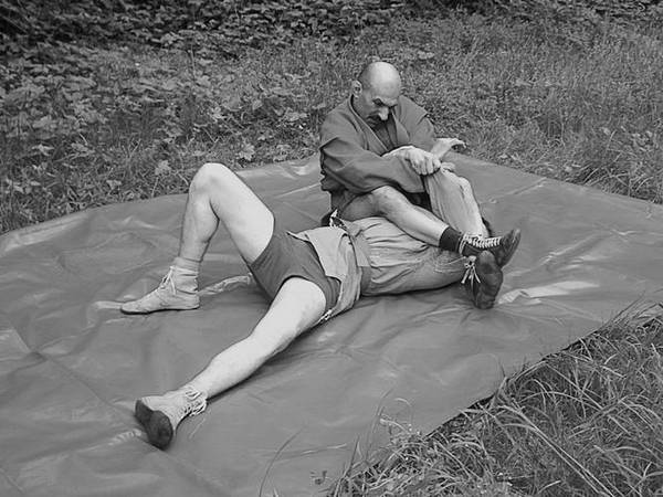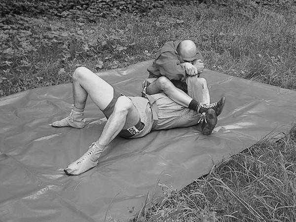 Иногда во время схватки борец сильно сжимает ноги, например при проведении болевого приема на руку. При таком статическом напряжении может сводить мышцы. Кстати, если свело судорогой икроножные мышцы и заднюю группу мышц бедра, что в схватке иногда случается, нужно сесть, выпрямить ногу и максимально согнуть на себя стопу. Это можно сделать самостоятельно или с помощью партнера.