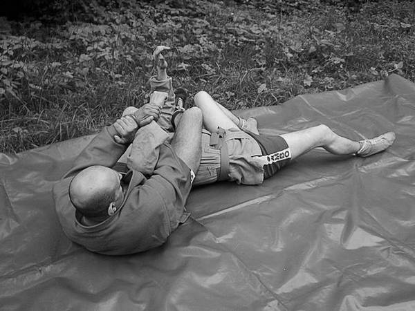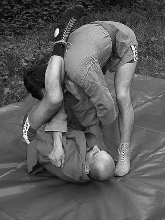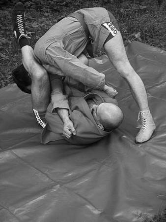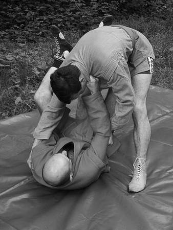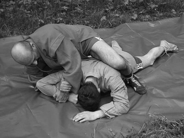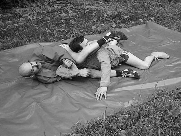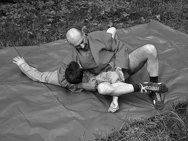 Непосвященному может показаться, что противник, будучи сверху, находится в более выгодном положении, но это совсем не так. Коленями он опирается о покрытие, значит, ноги его выключены из атаки. Одна рука захвачена вами, свободной остается только одна конечность, в то время как у вас свободны все четыре, которые атакуют его одну.