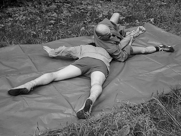 Разберем атаку на правую руку противника. Захватите ее выше локтевого сгиба, уперевшись правой голенью ему в грудь так, чтобы колено находилось в области левой половины груди, а голень и стопа лежали передней частью выше крыла подвздошной кости (тазовая кость). Не ослабляя захвата, подтянитесь к руке противника, встав на плечи и шею (как при упражнении «вращение тазом» – II гл., 74), заведите левую ногу подколенной ямкой ему на подбородок. При этом повернитесь головой к его левой ноге, чтобы оси вашего и его туловища составили перпендикуляр. Отжимая голову противника левой ногой, положите его спиной на ковер и проведите рычаг локтевого сустава.