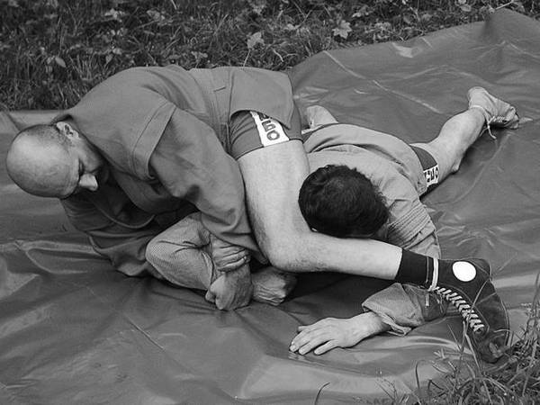 В этой позиции противник может оказаться сразу после проведенного вами броска, когда он из положения лежа на животе и груди начинает вставать. После выполненного броска вы находитесь сверху. Захватив руку указанным способом, опрокиньтесь на спину, переворачивая противника, и проведите рычаг локтевого сустава в классическом варианте.