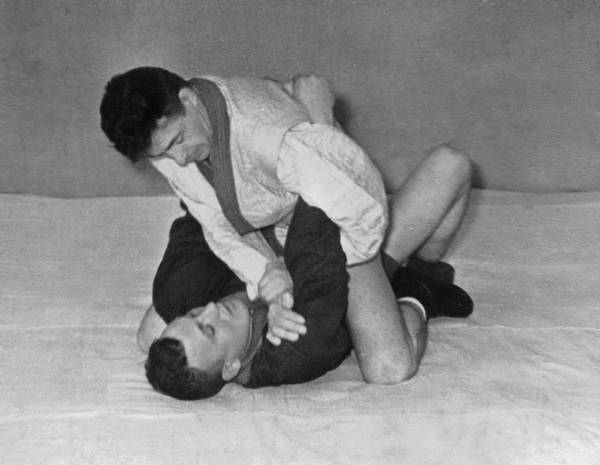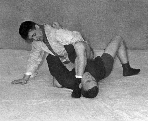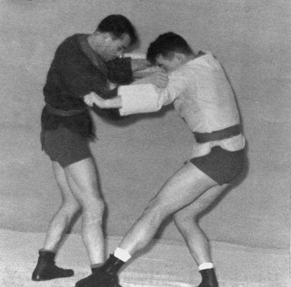 в. Подтянувшись на рукавах противника, сделать кувырок назад, оказавшись верхом на нем. Зажав его правую руку в своей левой подмышечной впадине, провести рычаг локтя через свое бедро.