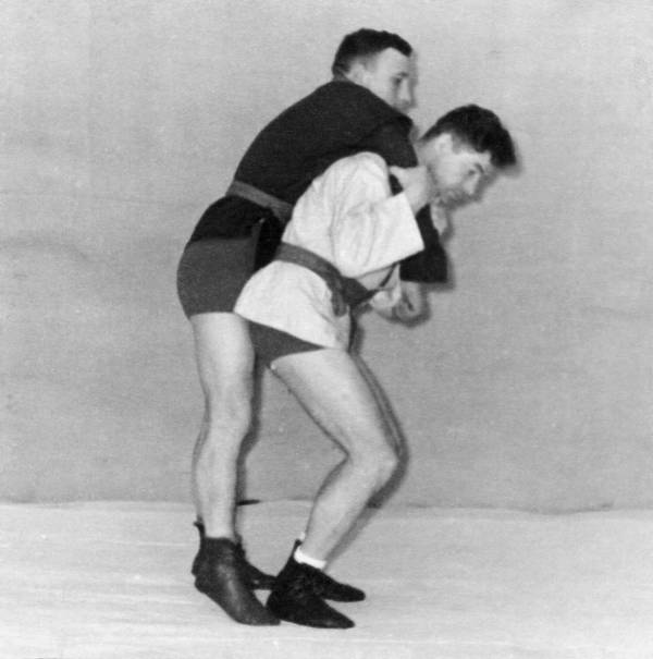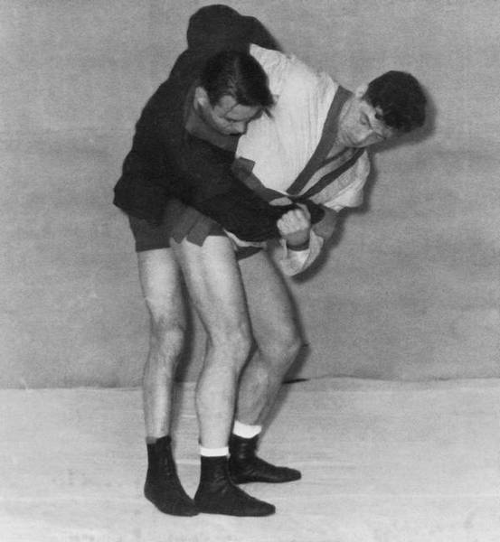 а. Подвернуться на бросок через спину, захватив двумя руками правую руку противника и согнув ноги в коленных суставах. Соприкосновение груди соперника со спиной проводящего бросок должен быть очень плотным. Его подмышечная впадина ложится на надплечье самбиста.