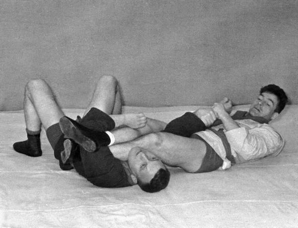 г. После проведения удержания перейти на рычаг локтевого сустава через бедро. Для проведения этого приема следует захватить левой рукой разноименную руку противника в области лучезапястного сустава и выгибать ее против естественного сгиба, в противоположную сторону от большого пальца, приподнимая навстречу свое бедро.