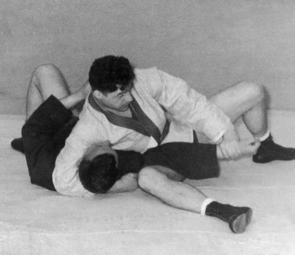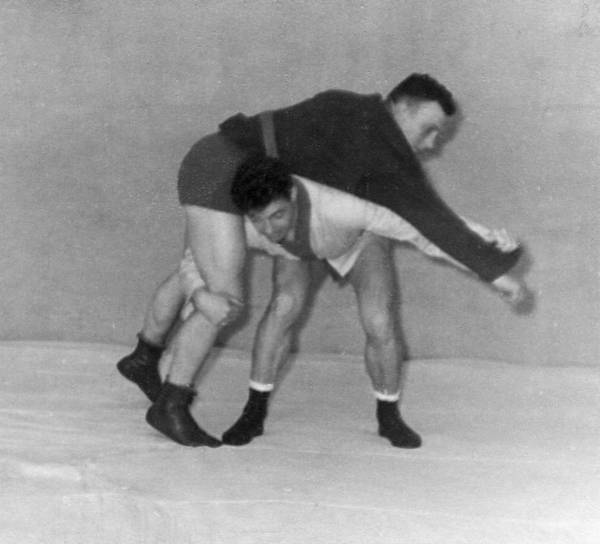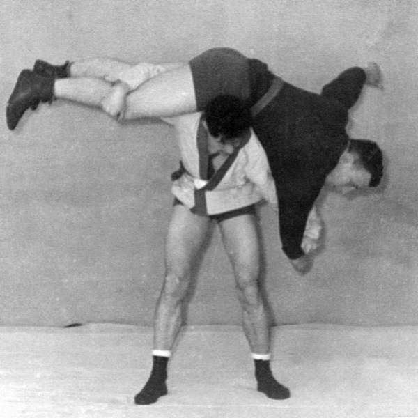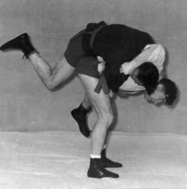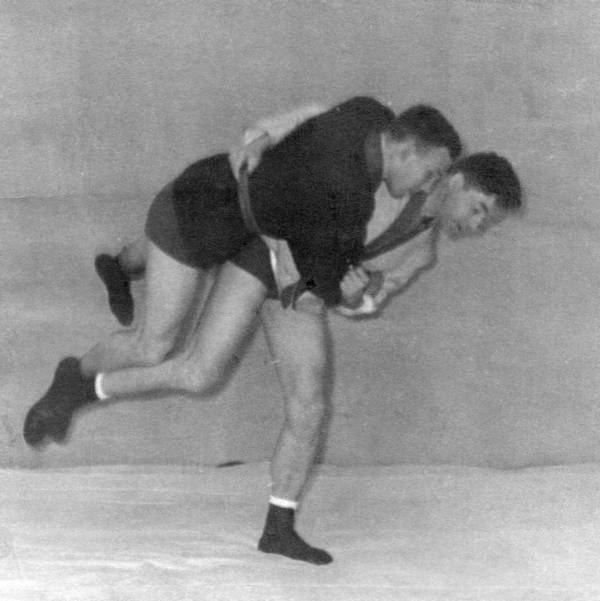 а. Подшагнуть правой ногой и подсев, подойти грудью к правому бедру противника, а захватом за разноименный рукав и соответствующую ему ногу взять его на плечи. При этом продолжать тягу за рукав вниз, за ногу – вверх.