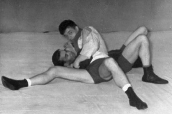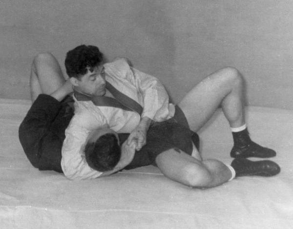 г. Упасть справа от противника, провести удержание сбоку с захватом руки и головы, после чего предплечье соперника в нижней трети, помогая себе левой рукой, завести таким образом, чтобы оно оказалось плотно зажатым в подколенной ямке самбиста. Для проведения болевого приема нужно опустить свою ногу вдоль туловища противника к его ногам.
