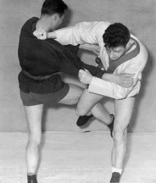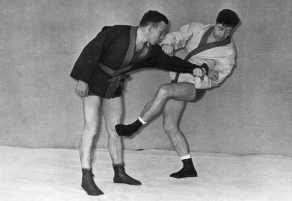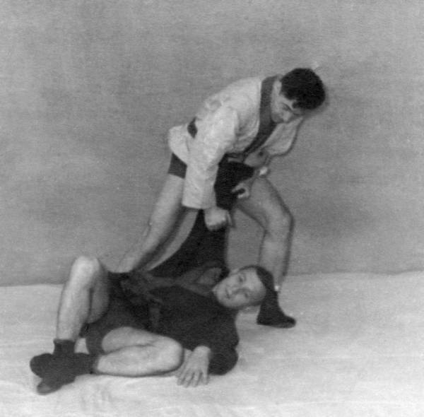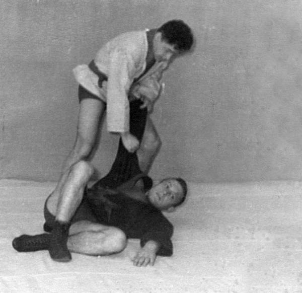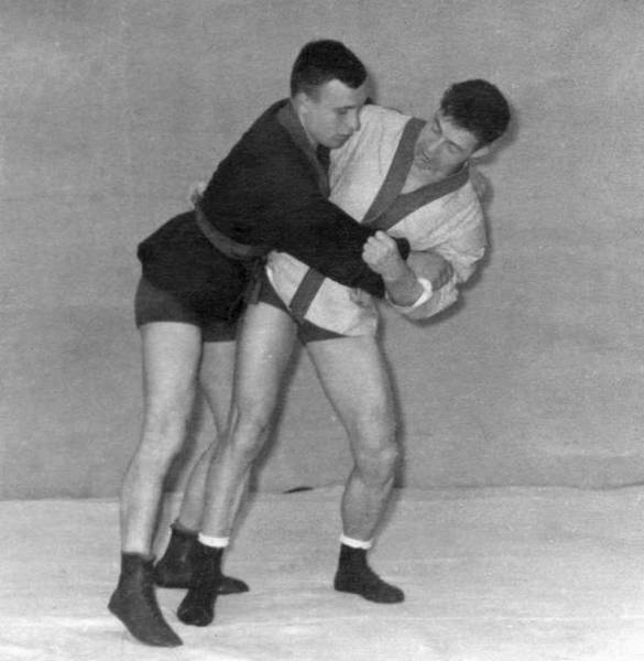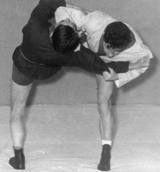а. Подшагнув правой ногой, левой упереться в левый коленный сустав противника, захватив его левый рукав двумя руками