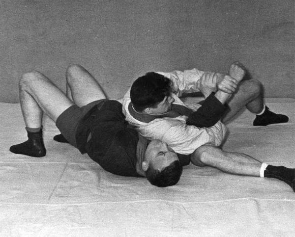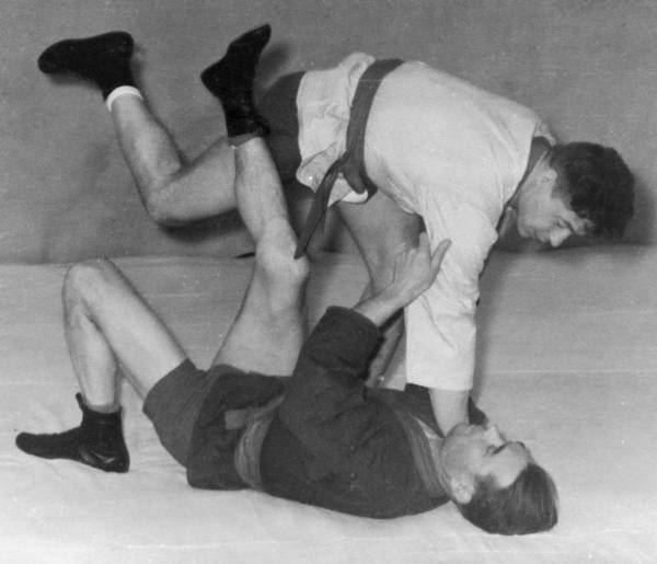 12. Бросок через плечи с захватом за одноименную руку с переходом на удержание сбоку и болевой прием «узел» плечевого сустава ногой от удержания поперек.