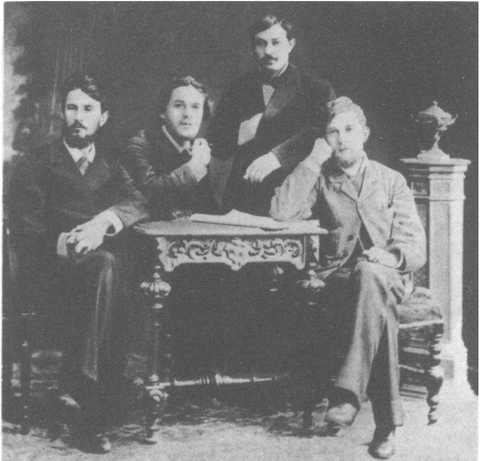 Студенты Московского университета: В. И. Зембулатов, А. П. Чехов, Н. И. Коробов, Д. Т. Савельев. 1884 г. Москва. Фото Н. Л. Пушкарева.