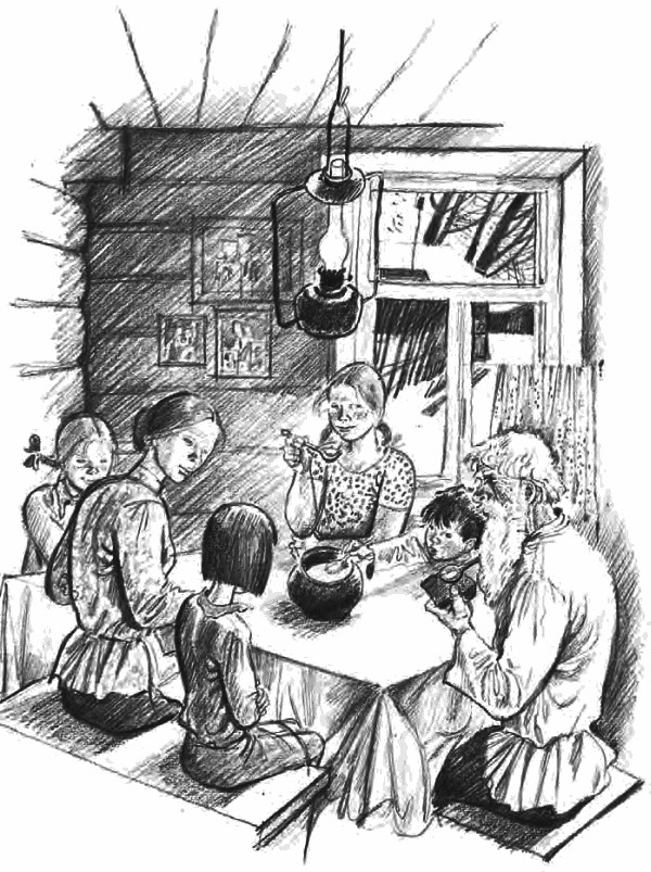 Валентинка ждала, когда ей дадут тарелку. Но никаких тарелок не подали на стол, а все ели прямо из большой миски. Ложки у нее тоже не оказалось. Она сидела молча, положив руки на колени, и не знала, что делать.