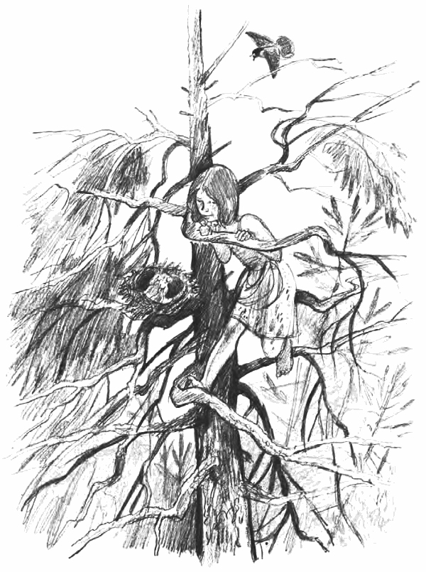 Аниска подобрала подол, заткнула за пояс и полезла на корявую смолистую елку. Обдираясь о сучья, морщась от сухой хвои, которая набивалась ей в волосы и сыпалась в глаза, Аниска упрямо лезла все выше и выше. Она карабкалась трудно, долго. А когда уселась на большом суку передохнуть и подняла глаза, то увидела, что гнездо уже совсем близко, над самой ее головой. Она перебралась повыше и заглянула в гнездо.
