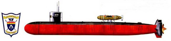 Внизу: SSN-672 «Пинтадо» – одна из лодок типа «Стержен», вторая в ВМС США, названная «Пинтадо». В мае 1974 г. эта субмарина столкнулась с советским подводным ракетоносцем типа Yankee на глубине 200 футов, столкновение произошло в районе советского порта Петропавловск-Камчатский. Советская лодка после столкновения немедленно всплыла на поверхность. «Пинтадо» под водой тихонько удалилась к Гуаму, где встала на семинедельный ремонт в сухой док.