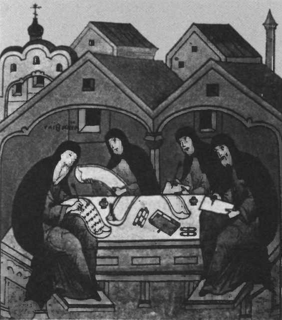 Доброписцы. Миниатюра из «Жития Сергия Радонежского». Конец XVI в.