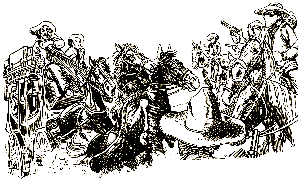 Но, отъехав от гостиницы всего несколько километров, кучер вдруг резко натягивает поводья. Лошади останавливаются как вкопанные. Путь вам перегородили семеро всадников. В руках у них револьверы, а лица повязаны платками.