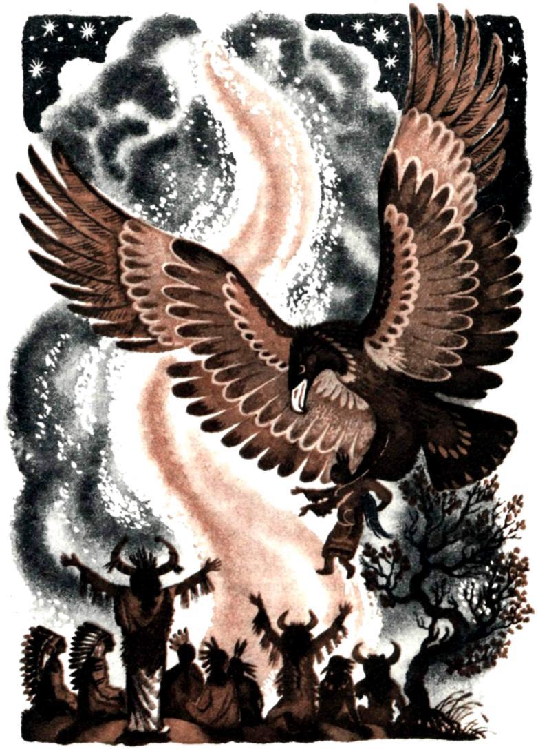 Высоко-высоко — над самой серединой озера — парил стервятник с девушкой в когтях. Потрясённые люди упали на колени, а собаки, поджав хвосты, приникли к земле. Откуда-то издали, словно из глубины озера или из скал, загремел голос: