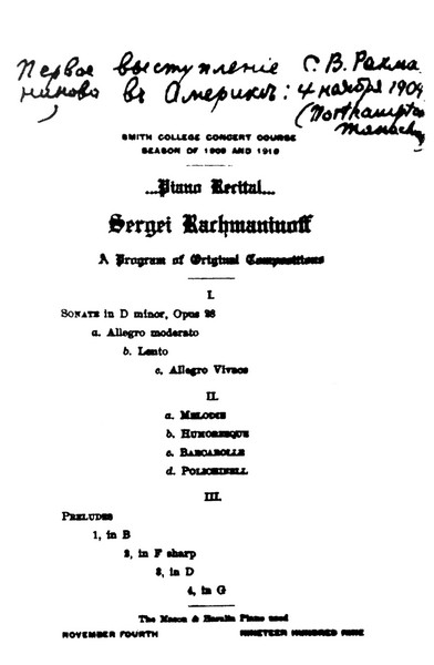 Плотный график концертов выматывал: с 4 ноября по 31 января — 26 выступлений. В сущности — концерт через день. Сначала Нортгемптон, городок в штате Массачусетс. Потом Филадельфия, Балтимор, Нью-Йорк, Хартфорд, Бостон, Торонто, снова Нью-Йорк, Цинциннати, снова Филадельфия, опять Нью-Йорк, Чикаго, Питсбург… По большей части — симфонические концерты, где русский музыкант выступал солистом, играл Второй и Третий концерты. Иногда вставал и за дирижёрский пульт. Клавирабендов он дал мало, но первое выступление в маленьком городке — именно такое: пианист Рахманинов исполняет собственные произведения.